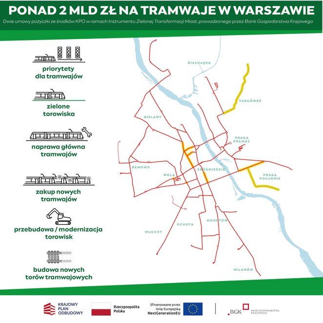 Pożyczka z KPO, oprocentowana na poziomie 1 proc. w skali roku, udzielona została na 20 lat bez dodatkowych prowizji czy marży. Tak korzystne warunki pozwolą spółce Tramwaje Warszawskie utrzymać stabilność finansową i przyspieszyć realizację kluczowych inwestycji.