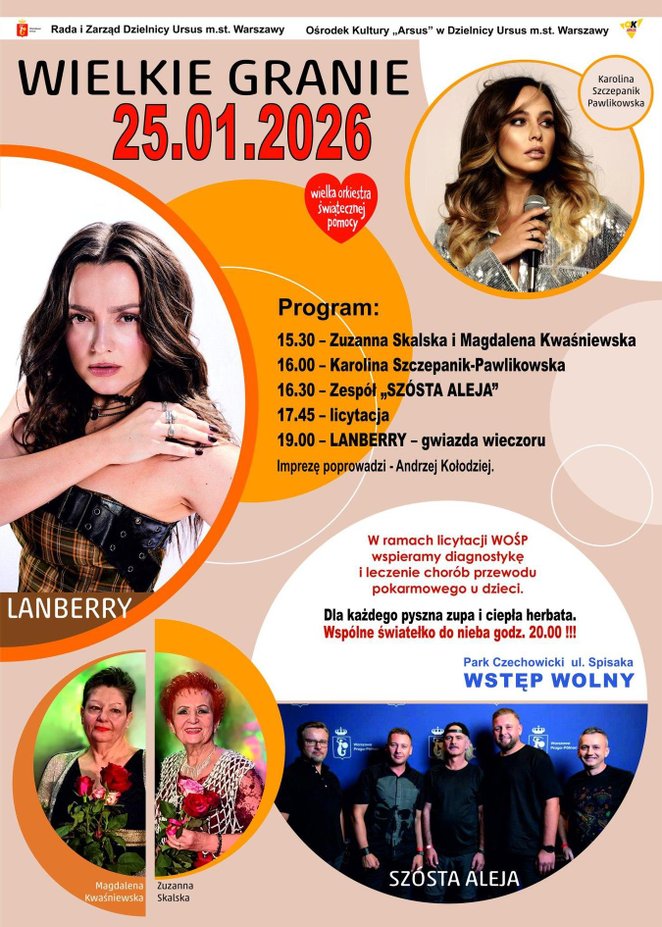 W najbliższą niedzielę, 25 stycznia, dzielnica Ursus zaprasza mieszkańców na wydarzenie Wielkie Granie i Bieganie. W programie zaplanowano sportową rywalizację, występy artystyczne oraz finałowy koncert popularnej wokalistki Lanberry. Całość odbywa się w ramach wsparcia Wielkiej Orkiestry Świątecznej Pomocy.
