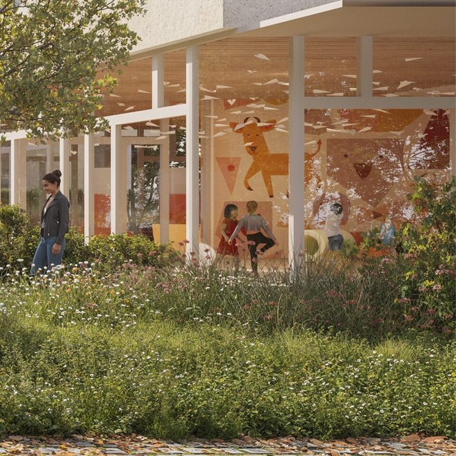Najważniejszym elementem tej inwestycji ma być jednak przestrzeń społeczna. W projekcie przewidziano lokal oświatowy o powierzchni około 750 metrów kwadratowych, w którym mogłoby powstać przedszkole dla około 100 dzieci. Wraz z nim zaplanowano plac zabaw, stojaki rowerowe oraz infrastrukturę dla rodziców i pracowników placówki.