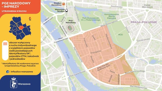 Od godziny 18:30 obszar Saskiej Kępy zostanie wyłączony z ogólnodostępnego ruchu kołowego. Do godziny 20:45 wjazd w okolice ograniczone ulicami: aleja Poniatowskiego, aleja Waszyngtona, Międzynarodowa, aleja Stanów Zjednoczonych, Wał Miedzeszyński oraz Bora-Komorowskiego i Afrykańska, będzie możliwy tylko dla: