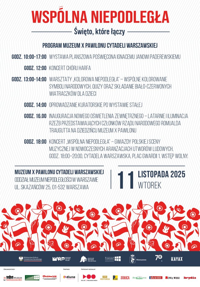 W Muzeum X Pawilonu Cytadeli Warszawskiej przy ul. Skazańców 25 11 listopada o godz. 12.00 odbędzie się festiwal „Wspólna Niepodległa”, który ma połączyć Cytadelę Warszawską i Krakowskie Przedmieście w centrum obchodów Święta Niepodległości. Uczestnicy mogą się spodziewać koncertów, gier edukacyjnych, warsztatów, parady rekonstruktorów czy wspólnego śpiewania hymnu.