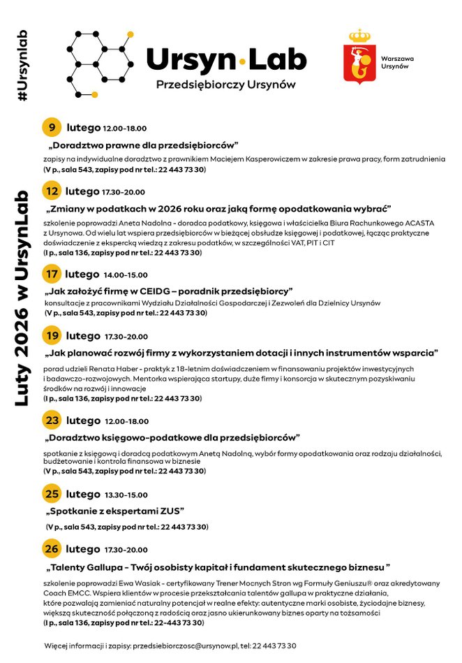 UrsynLab przygotował bogaty program bezpłatnych spotkań, konsultacji i szkoleń skierowanych do przedsiębiorców oraz osób myślących o założeniu działalności gospodarczej. W lutym uczestnicy będą mogli skorzystać z praktycznej wiedzy ekspertów z zakresu prawa, podatków, księgowości, dotacji oraz rozwoju kompetencji biznesowych.