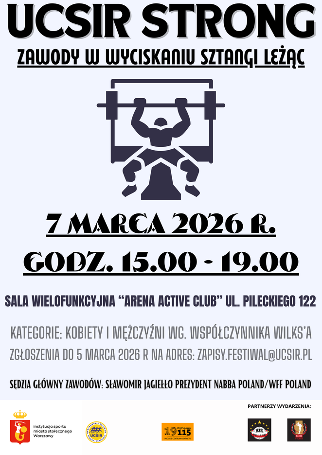 Rywalizacja w wyciskaniu sztangi to jedna z najbardziej rozpoznawalnych konkurencji w świecie fitnessu i kulturystyki. Nadchodzące zawody pod nazwą UCSiR Strong dają szansę na sportowe zmierzenie się z innymi pasjonatami w profesjonalnych warunkach. Całość odbędzie się w sali wielofunkcyjnej Arena Active Club, która znajduje się przy ulicy Pileckiego 122 na warszawskim Ursynowie.