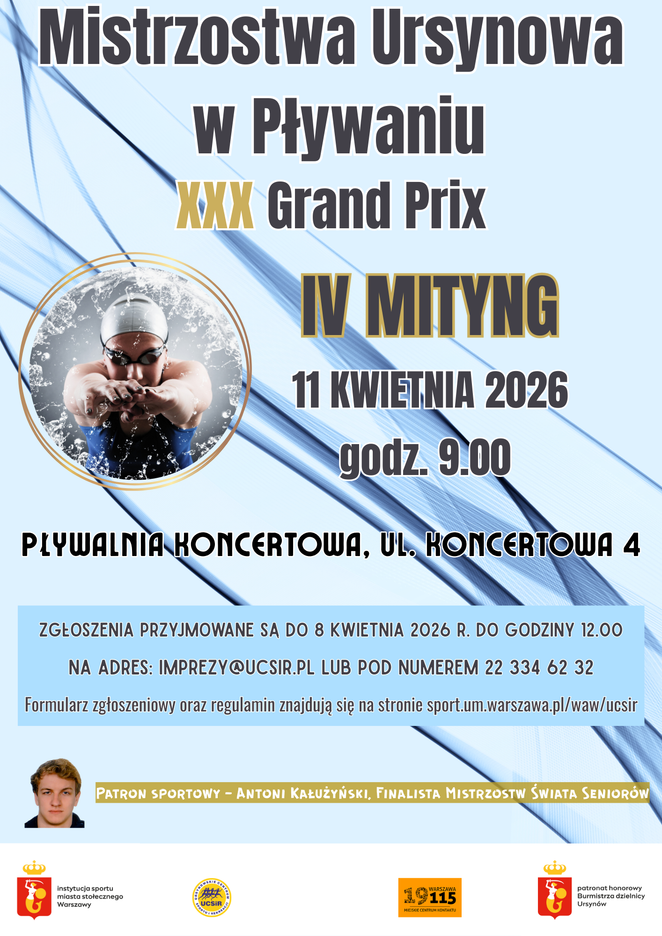 Warszawski Ursynów znów stanie się areną sportowych emocji. Ursynowskie Centrum Sportu i Rekreacji zaprasza mieszkańców do udziału w IV mityngu „Mistrzostw Ursynowa w Pływaniu – XXX Edycja Grand Prix”. Zawody odbędą się 11 kwietnia 2026 roku na pływalni Pływalnia Koncertowa przy ul. Koncertowej 4. Pierwsze starty zaplanowano na godz. 9.