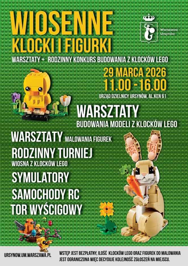 Wydarzenie zaplanowano na 29 marca w godz. 11-16 w sali 136 ursynowskiego ratusza. Głównym punktem programu będzie rodzinny konkurs budowania z klocków Lego, którego tematem przewodnim stanie się wizja nadchodzącej wiosny.