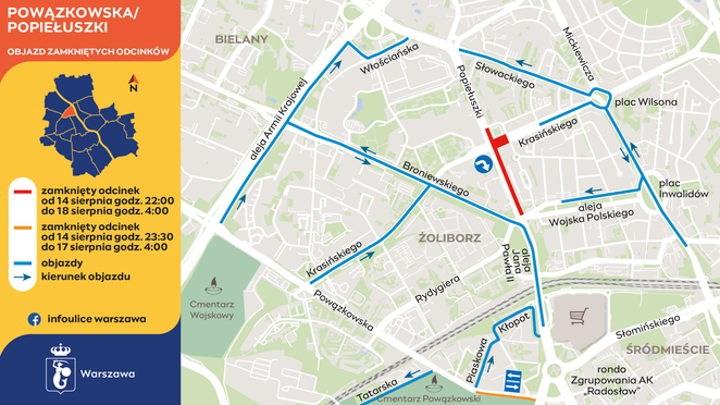 Prace na ulicy Powązkowskiej rozpoczną się w czwartek, 14 sierpnia, około 23:30 i potrwają do niedzieli, 17 sierpnia, do godziny 4. W tym czasie zamknięte zostaną dwa pasy w kierunku Okopowej, a ruch w obu kierunkach będzie odbywał się po jednym pasie drugą stroną jezdni. Kierowcy mogą spodziewać się braku możliwości parkowania po stronie kościoła św. Karola Boromeusza. Z kolei z Piaskowej wyjazd będzie możliwy tylko w prawo. Ważna informacja dla transportu ciężarowego: z Powązkowskiej nie będzie można skręcić w prawo w Okopową.