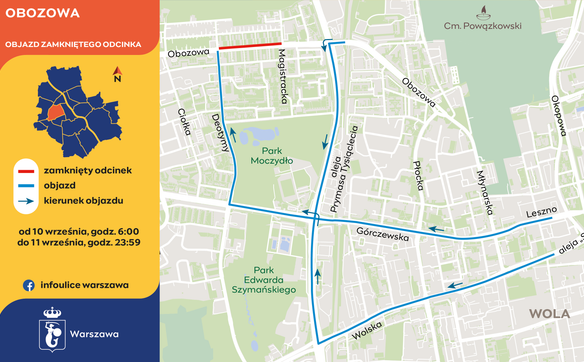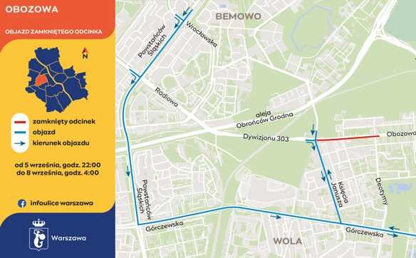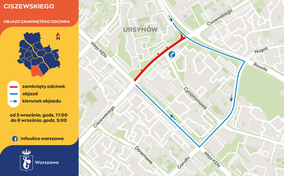 - Objazd dla samochodów poprowadzono ulicami: Rosoła, Gandhi i aleją Komisji Edukacji Narodowej. Z ulicy Cynamonowej na Ciszewskiego będzie można wyjechać tylko w prawo, w stronę Nowoursynowskiej.