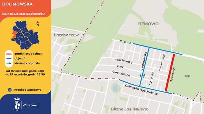 Objazd zostanie poprowadzony ulicą Podkowińską. Dodatkowo, w czasie robót ulice: Arkadyjska, Spychowska, Radziejowicka i Otrębuska stracą połączenie z Bolimowską. Na czas remontu na Bolimowskiej i Podkowińskiej wprowadzony zostanie zakaz parkowania. Pozostawione pojazdy mogą zostać odholowane.