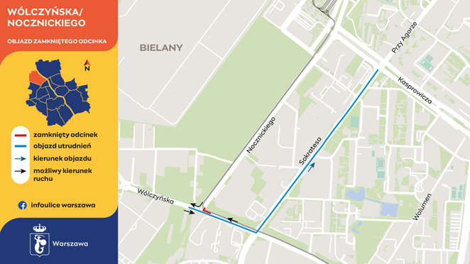 Dla kierowców oznacza to, że w trakcie nocnych robót przejazd ulicą Wólczyńską będzie możliwy wyłącznie na wprost. Co kluczowe, w tym czasie nie będzie można skręcić w Nocznickiego z Wólczyńskiej. Jednocześnie, pojazdy nadjeżdżające ulicą Nocznickiego od strony Młocin, będą miały możliwość skrętu jedynie w prawo, w kierunku ulicy Arkuszowej.