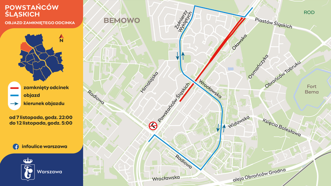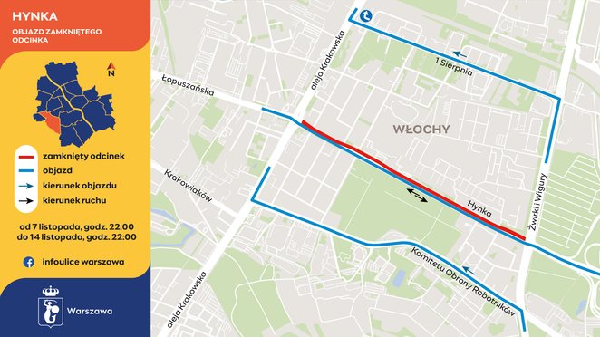 Od piątku, 7 listopada, od godziny 22:00 do piątku, 14 listopada, do godziny 22:00 potrwa wymiana nawierzchni ulicy Hynka w kierunku Łopuszańskiej. W tym czasie zamknięta będzie nitka jezdni prowadząca w stronę Łopuszańskiej – od ulicy Żwirki i Wigury do alei Krakowskiej.