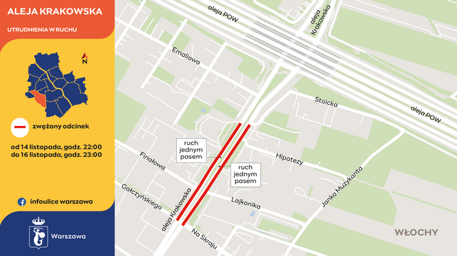 Na obu jezdniach Alei Krakowskiej, zarówno w kierunku wyjazdu z Warszawy, jak i w kierunku trasy S2, zamknięte zostaną po dwa pasy – prawy i środkowy. Oznacza to, że kierowcy będą mieli do dyspozycji jedynie po jednym pasie ruchu w każdym kierunku.