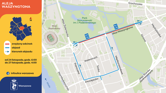 W związku z frezowaniem jezdni, zamknięte zostały dwa pasy ruchu w kierunku od ronda Waszyngtona do Kinowej. Ruch w obu kierunkach – w stronę Kinowej i w stronę ronda Waszyngtona – odbywa się teraz drugą stroną jezdni, po jednym pasie w każdą stronę.