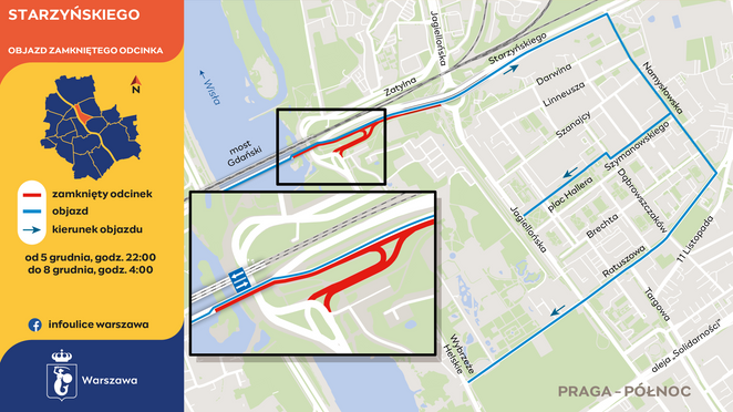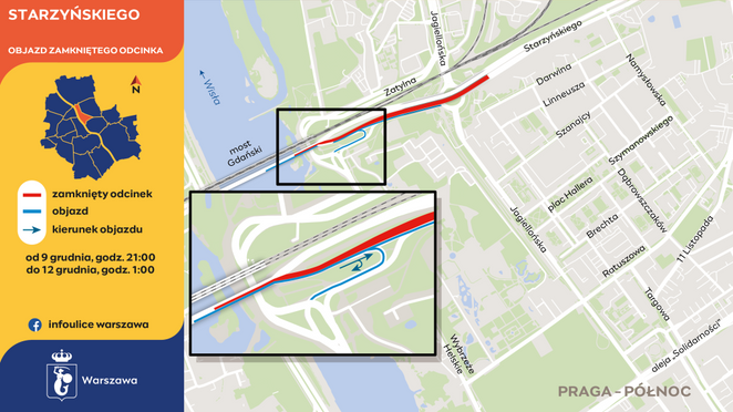 zamknięcie jezdni prowadzącej z Mostu Gdańskiego w stronę ronda Starzyńskiego;