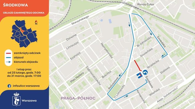 Inwestycja rozpoczyna się od zamknięcia fragmentu drogi między ulicami Kowieńską a Strzelecką. Wykonawca planuje wejść na teren prac rano o godz. 7. To pierwszy krok w stronę realizacji ambitnego projektu autorstwa pracowni WXCA, która zwyciężyła w konkursie architektonicznym na nową wizję ulic Nowej Pragi.