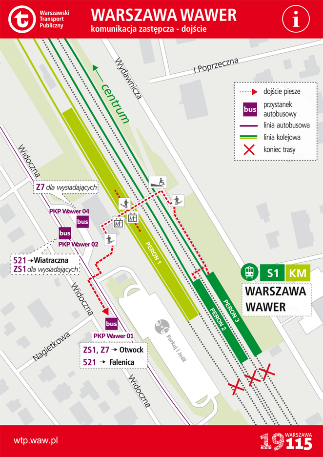 Pojazdy linii ZS1 będą zatrzymywać się na wszystkich przystankach na trasie. W godzinach szczytu pasażerowie mogą liczyć na kursy co 10 minut, a w pozostałych godzinach oraz w niedziele co 15 minut. Warto zwrócić uwagę na organizację przystanków: w Falenicy tymczasowy przystanek znajdzie się na wysokości stacji (dojście przez przejście podziemne), a w Wawrze przy ulicy Widocznej, tuż przy wejściu na perony.