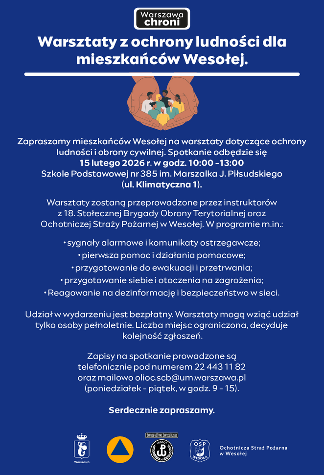 Wydarzenie odbędzie się 15 lutego 2026 roku w murach Szkoły Podstawowej nr 385 przy ulicy Klimatycznej 1. Zajęcia zaplanowano w godz. 10-13. Warsztaty mają charakter praktyczny, a poprowadzą je profesjonaliści, którzy na co dzień dbają o bezpieczeństwo obywateli – instruktorzy z 18. Stołecznej Brygady Obrony Terytorialnej oraz strażacy z Ochotniczej Straży Pożarnej w Wesołej.