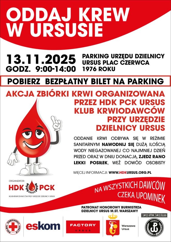 Mieszkańcy Ursusa będą mieli okazję 13 listopada dołączyć do szlachetnego grona dawców krwi. To kolejny punkt na mapie działań Klubu Honorowych Dawców Krwi Polskiego Czerwonego Krzyża (HDK PCK) Ursus w tym roku.