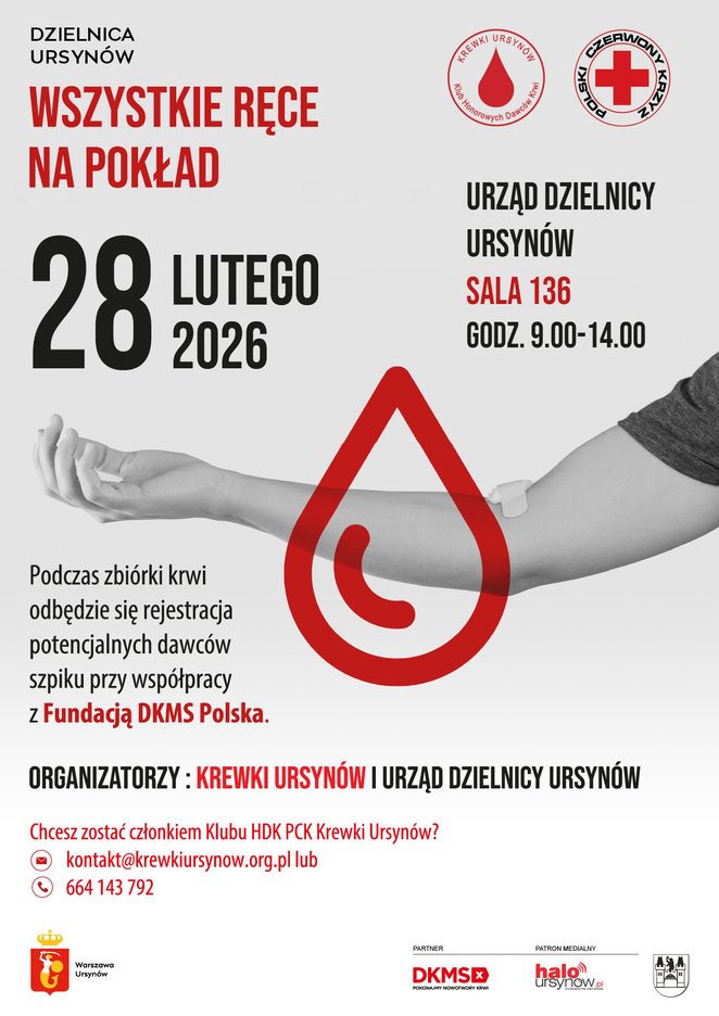 W sobotę, 28 lutego, w godz. 9-14 mieszkańcy będą mogli oddać krew podczas stacjonarnej zbiórki w sali 136 urzędu przy al. KEN 61. Akcję organizuje Klub Honorowych Dawców Krwi Krewki Ursynów przy wsparciu Urząd Dzielnicy Ursynów m.st. Warszawy.